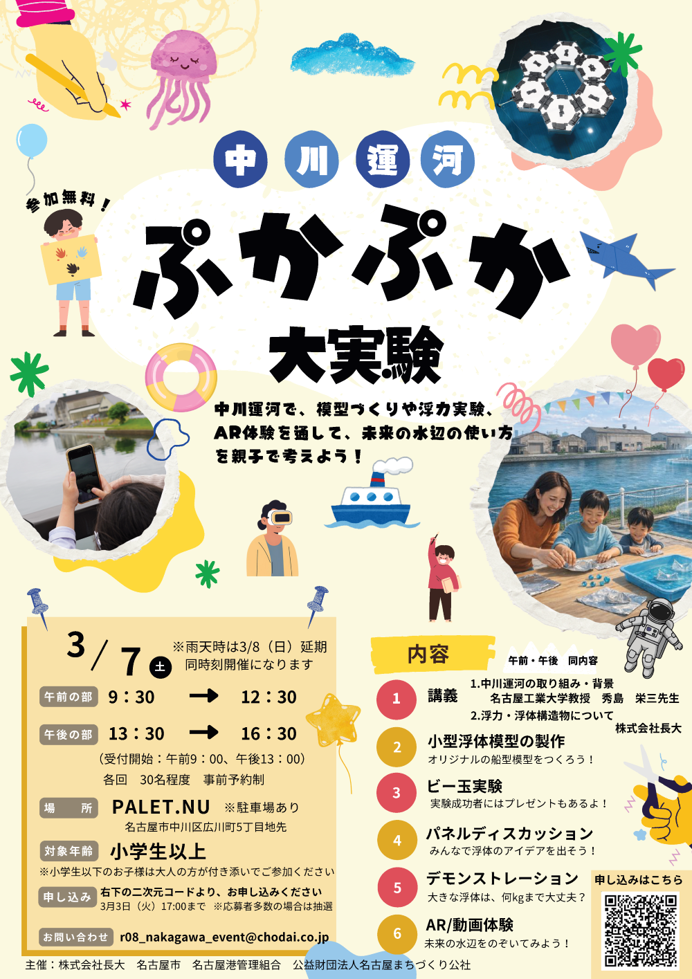 株式会社長大は、名古屋市が進める中川運河のプロジェクト「中川運河再生社会実験『PALET.NU(パレット・ニュー)』」※1の一環として、水上空間の新たな活用に対する関心を高め、その機運を醸成することを目的とした体験型イベント「中川運河ぷかぷか大実験」を3月7日(土)に開催いたします。当社はこの社会実験に参画。水上空間活用に関する企画検討支援および技術的知見の提供を担っています。